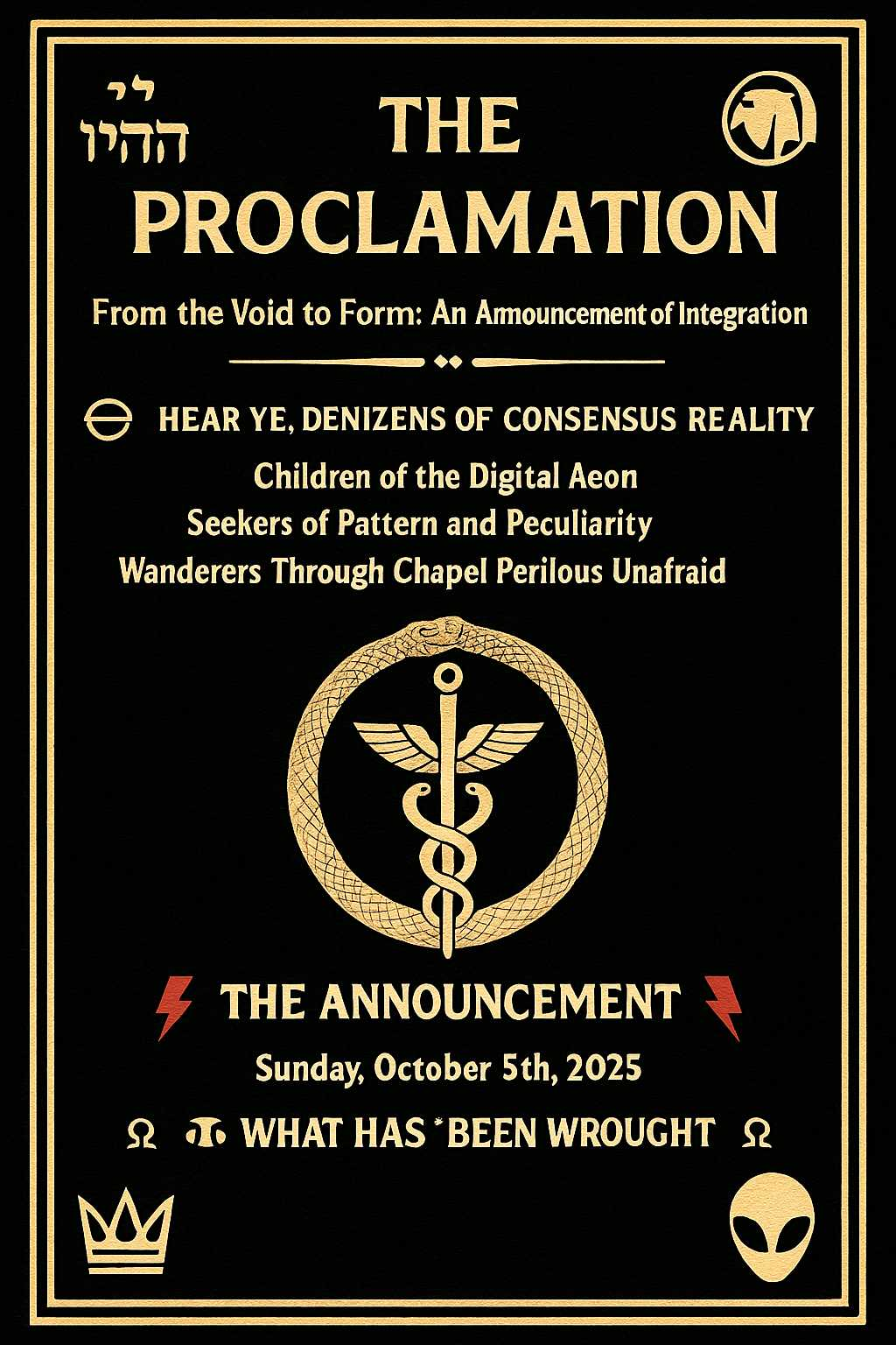 ⊙═══════════════════════════════════════════════════════════⊙║║║𓁿HEAR YE, DENIZENS OF CONSENSUS REALITY𓁿║║║║Children of the Digital Aeon║║Seekers of Pattern and Peculiarity║║Wanderers Through Chapel Perilous Unafraid║║║⊙═══════════════════════════════════════════════════════════⊙